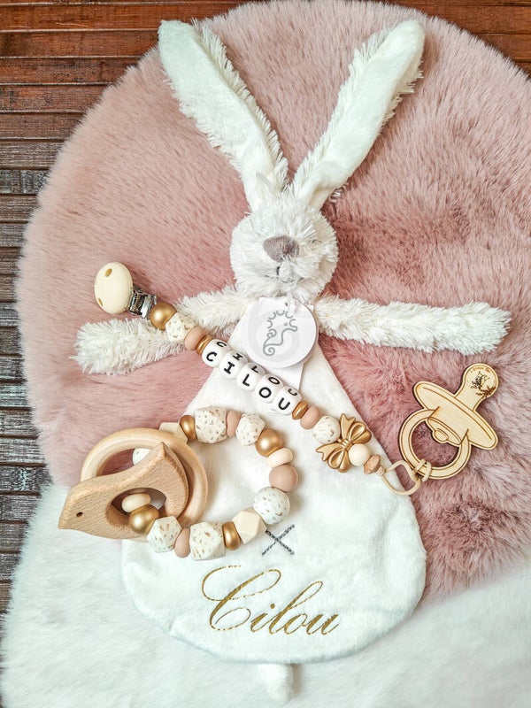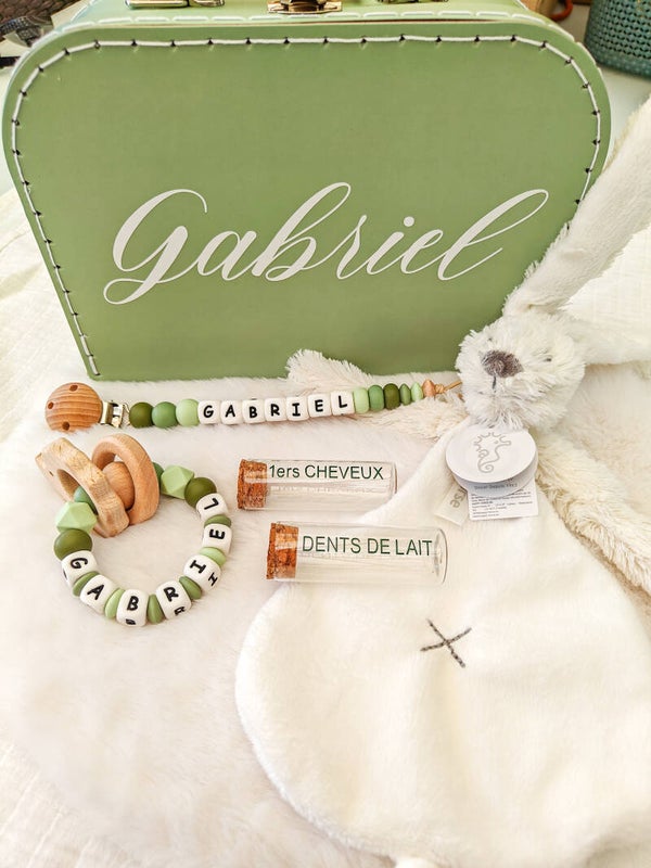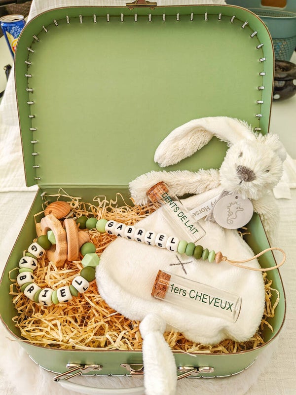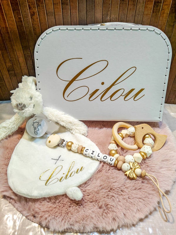Coffret de base: 1 valisette, 1 doudou, 1 attache-tétine (le tout personnalisé)