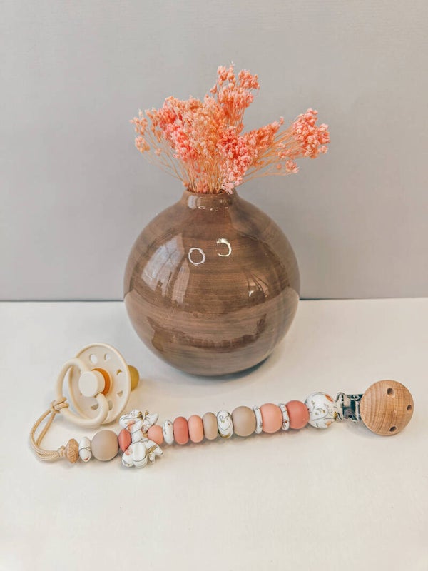 Mes attaches-tétines sont réalisées à partir de perles en silicone alimentaire et de bois de hêtre naturel non traité, garantissant une utilisation sans danger pour bébé.