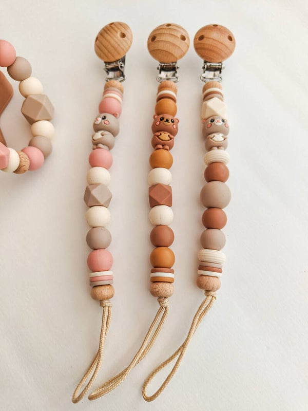 Mijn speenkoorden zijn gemaakt van siliconen kralen van voedingskwaliteit en onbehandeld natuurlijk beukenhout, wat een veilig gebruik voor uw baby garandeert.